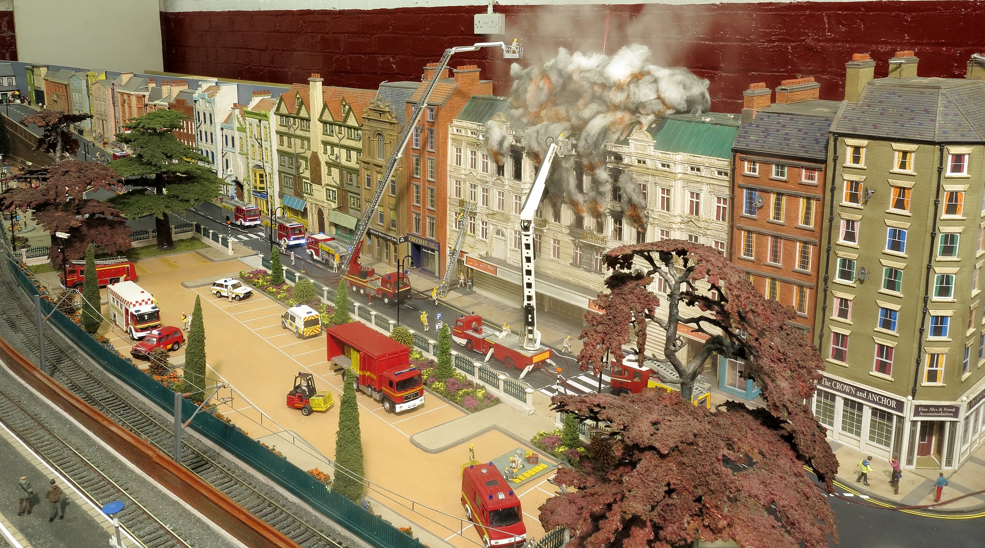 On leaving the station we pass the smouldering remains of the local theatre and the fire brigade packing up after successfully dealing with the inferno. The branch line runs parallel to the main line as they head across the bridges over the harbour before diving into tunnels beneath the residential caravan park.